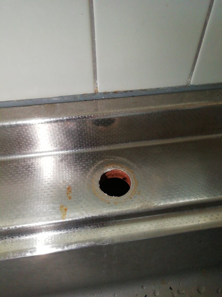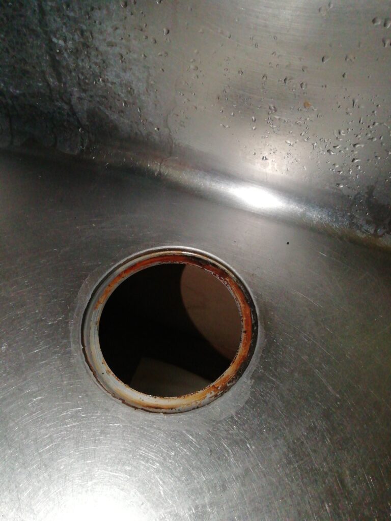 既存の排水栓を取ると設置部分が腐食し何箇所か穴が空いておりましたが、コーキングで補修を行い排水栓取付。