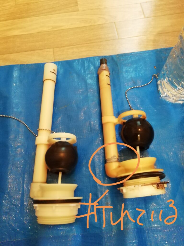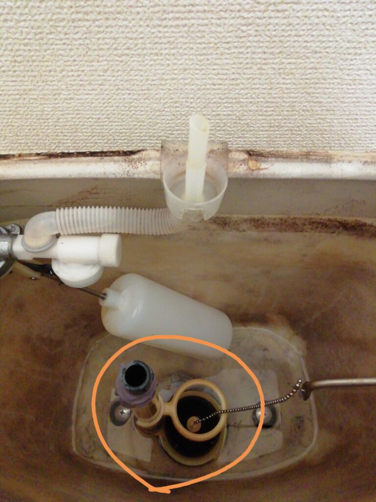 このオレンジの丸をしたサイフォン管(タンク内の水が溢れない様にする部材)が経年劣化により破損し折れてしまっていた為、割れ目から便器へ水漏れを起こしていました。